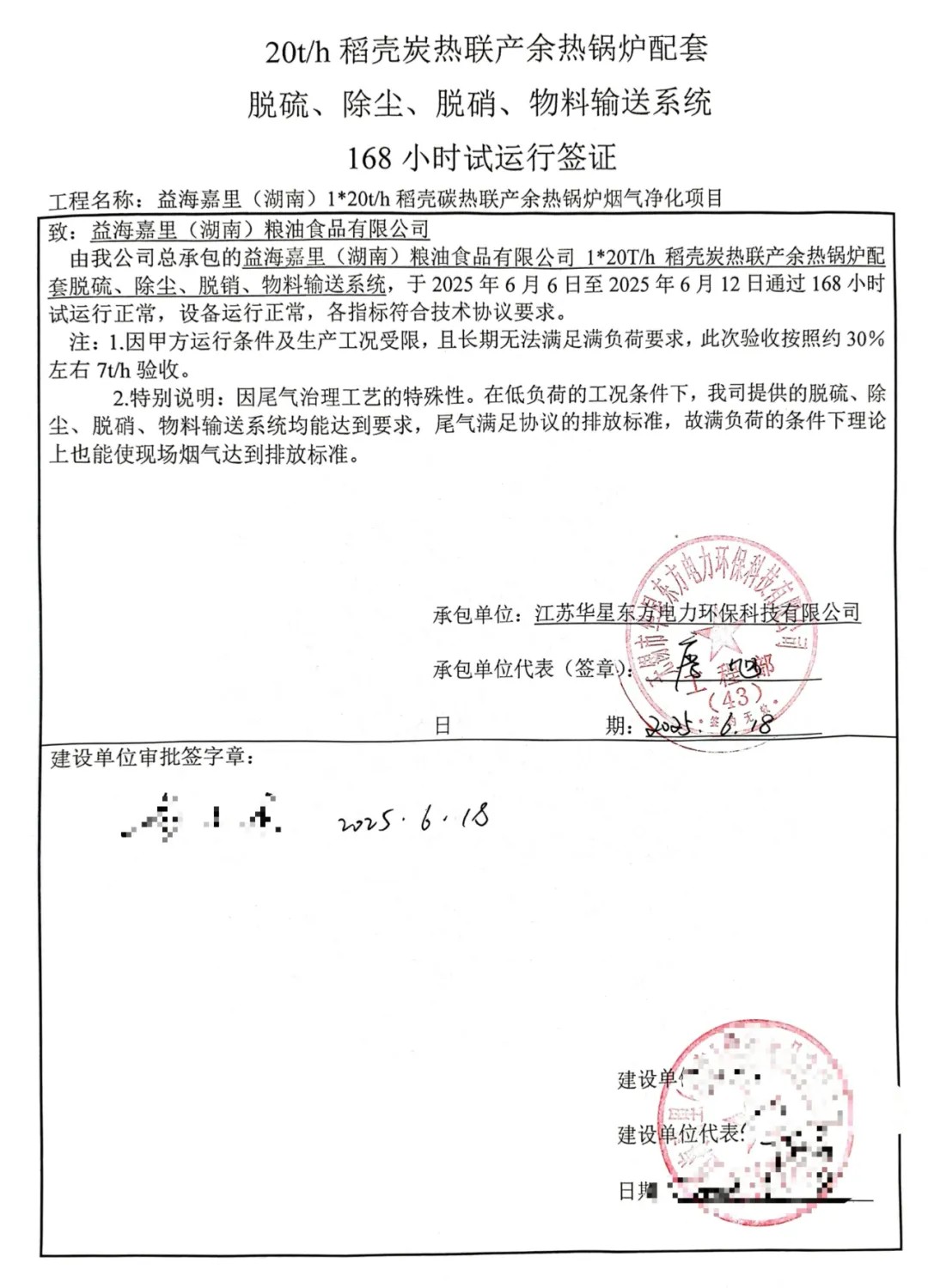 我公司承建的湖南省長(zhǎng)沙市益海嘉里稻殼碳熱聯(lián)產(chǎn)余熱鍋爐煙氣凈化項(xiàng)目于2025年06月12日通過168小時(shí)試運(yùn)行。 The FGC system of the Yihai Kerry rice-husk carbon heat cogeneration waste heat boiler, Changsha, Hunan, constructed by HEPT, has passed the 168-hour trial operation since June 12th 2025.