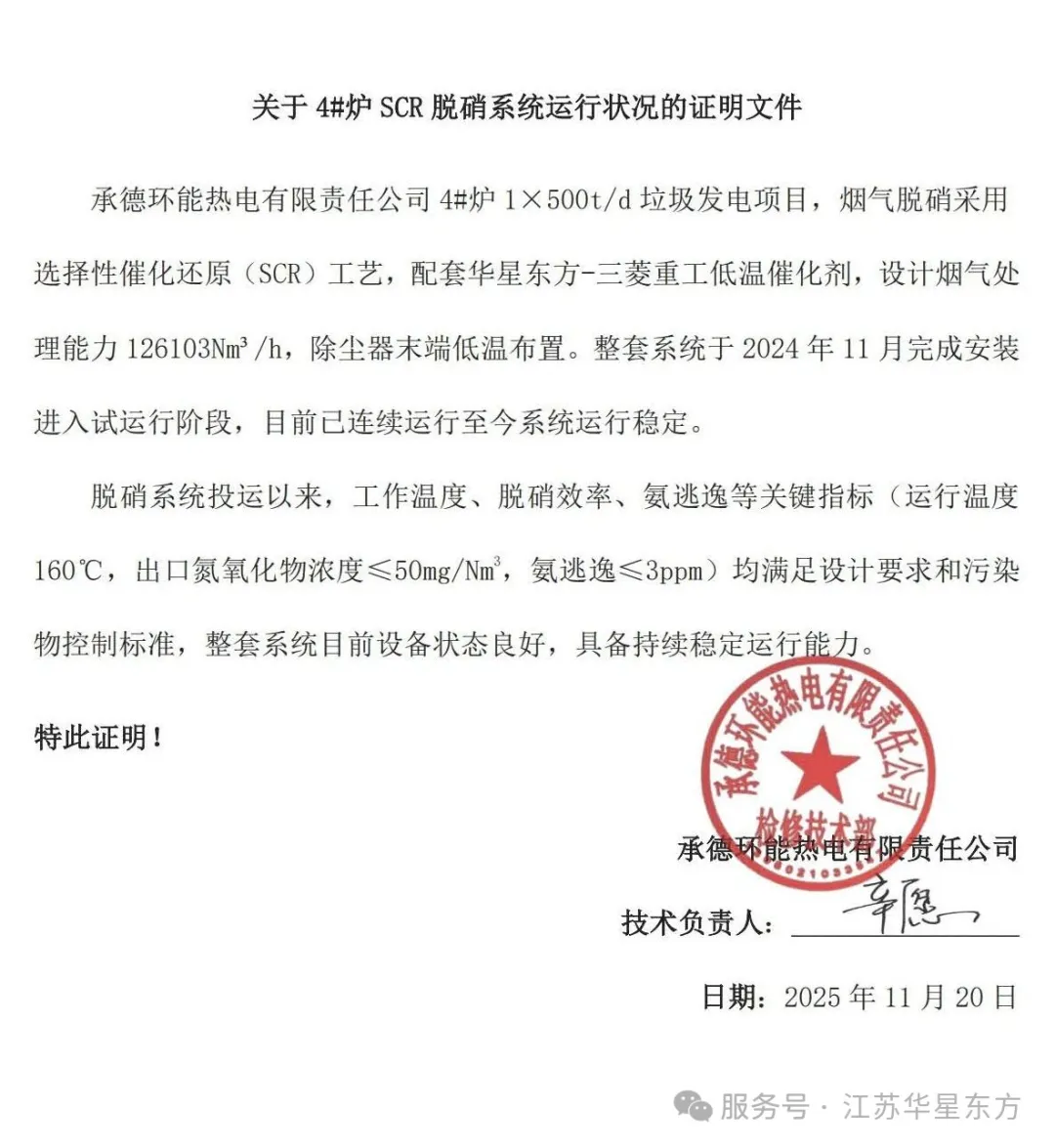 在“72+24”小時不間斷滿負(fù)荷試運行階段,此項目通過技改升級華星東方SCR低溫脫硝系統(tǒng)展現(xiàn)出顯著優(yōu)勢——通過提升120-180℃溫區(qū)的反應(yīng)活性,使氨逃逸率降低90%以上;配合催化劑成型工藝優(yōu)化,增強(qiáng)催化劑孔隙均勻性及耐硫性,延長使用壽命,減少停機(jī)更換損失。其出口排放的NOx濃度穩(wěn)定控制在35-45mg/Nm3(遠(yuǎn)低于50mg/Nm3設(shè)計標(biāo)準(zhǔn)),氨逃逸濃度低至0.1-0.8mg/Nm3(遠(yuǎn)低于8mg/Nm3限值),較傳統(tǒng)系統(tǒng)降低40%以上蒸汽耗量,直接削減年度運行成本約350萬元(蒸汽單價按120元/t)。 During the uninterrupted 72+24-hour full-load trial, the project demonstrated the striking advantages of HEPT’s upgraded low-temperature SCR denitration system: boosts activity in the 120–180 °C window and reduces NH? slip by over 90 %; optimized shaping gives the catalyst more uniform pores and better sulfur tolerance, extending service life and shortening outage time. NOx at the stack was steadily held at 35–45 mg/Nm3, well below the 50 mg/Nm3 design limit; NH? slip was as low as 0.1–0.8 mg/Nm3, far under the 8 mg/Nm3 cap; steam consumption dropped by more than 40 % compared with conventional systems, cutting annual operating costs by about CNY 3.5 million (steam priced at CNY 120/t). 這一成果源于華星東方二十余年深耕環(huán)保領(lǐng)域的技術(shù)積淀與低溫脫硝系統(tǒng)創(chuàng)新突破:通過在引進(jìn)三菱重工先進(jìn)技術(shù)的基礎(chǔ)上,歷經(jīng)數(shù)百次工況適配實驗與十余代技術(shù)迭代,持續(xù)優(yōu)化催化劑配方與反應(yīng)器結(jié)構(gòu),最終開發(fā)出更契合中國復(fù)雜氣候、多樣燃料特性及嚴(yán)苛排放標(biāo)準(zhǔn)的低溫脫硝解決方案。 This achievement stems from HEPT’s over twenty years of technical expertise in the environmental field and its breakthroughs in low-temperature denitration systems. Building on MHIEC’ advanced technology, the company has carried out hundreds of adaptation experiments and over ten generations of technical iterations, continuously optimizing catalyst formulations and reactor structures. The result is a low-temperature denitration solution better suited to China’s complex climate, diverse fuel characteristics and stringent emission standards. 當(dāng)前研發(fā)團(tuán)隊正推進(jìn)150℃超低溫運行試驗,探索催化劑在更寬溫度窗口(120-180℃)的穩(wěn)定性能,并配套開發(fā)智能氨水噴淋控制系統(tǒng),通過前期設(shè)計流場模擬實現(xiàn)精確噴氨及氨分布,實現(xiàn)“精準(zhǔn)噴射-高效轉(zhuǎn)化-零逃逸”閉環(huán)控制,預(yù)計可進(jìn)一步降低氨耗10%-15%。 The R&D team is now validating 150 °C ultra-low-temperature operation and developing an intelligent aqueous-ammonia spray control system. Up-front CFD modelling of the flow field will enable precise NH? injection and distribution, creating a closed loop of "accurate spraying–efficient conversion–zero slip", expected to cut ammonia consumption by a further 10–15 %. 該技改方案不僅解決了傳統(tǒng)SCR系統(tǒng)“低溫效率衰減、氨耗高、逃逸超標(biāo)”三大行業(yè)難題,更構(gòu)建了“設(shè)計-制造-運維”全鏈條成本優(yōu)化模型。結(jié)合項目采用的國際領(lǐng)先爐排爐工藝與成熟煙氣凈化技術(shù),實現(xiàn)了垃圾焚燒發(fā)電的“無害化處理+資源化利用”雙重目標(biāo)——通過焚燒發(fā)電將廢棄物轉(zhuǎn)化為電能,達(dá)成減量化與資源化;同時通過超低排放技術(shù)助力河北地區(qū)生態(tài)環(huán)境改善與空氣質(zhì)量提升,完美契合國家“雙碳”戰(zhàn)略與工業(yè)綠色轉(zhuǎn)型需求,為客戶創(chuàng)造“環(huán)保達(dá)標(biāo)+經(jīng)濟(jì)降本”的雙重價值。 This retrofit package not only solves the three industry pain points of conventional SCR—"low-temperature efficiency decay, high ammonia consumption, excessive slip"—but also builds a full-chain cost-optimization model covering design, manufacture and O&M. Coupled with the world-class grate furnace and proven gas-cleaning technologies adopted in the project, it achieves the dual goals of "harmless treatment + resource utilization" for waste-to-energy: waste is converted into electricity while emissions are kept ultra-low. The solution thus helps improve the ecological environment and air quality in Hebei, aligns perfectly with China’s "dual-carbon" strategy and green industrial transformation, and delivers the dual value of "compliance + cost reduction" for customers.